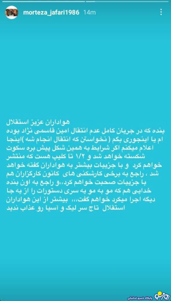 بعد از این ماجراها مدیر برنامه قاسمی نژاد هم با انتشار یک استوری اعلام کرده که ویدیوهایی در اختیار دارد که در صورت لزوم آن را منتشر خواهد کرد تا خیلی از مسائل در مورد عدم انتقال این بازیکن به استقلال مشخص شود.