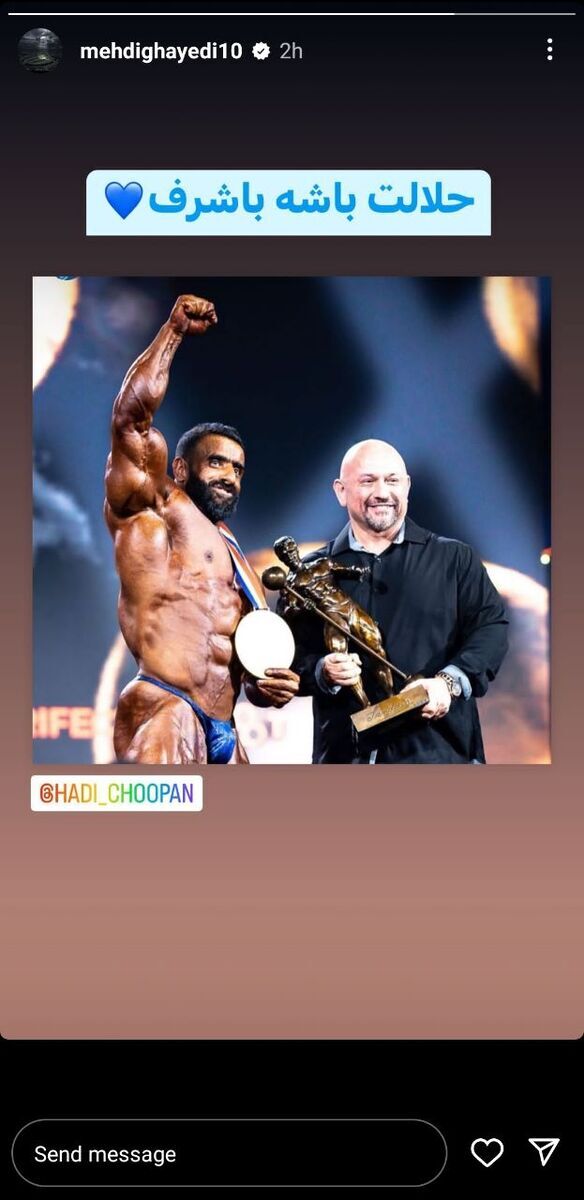 مهدی قایدی ستاره تیم فوتبال استقلال به قهرمانی هادی چوپان در مسابقات مستر المپیا واکنش جالبی نشان داد.