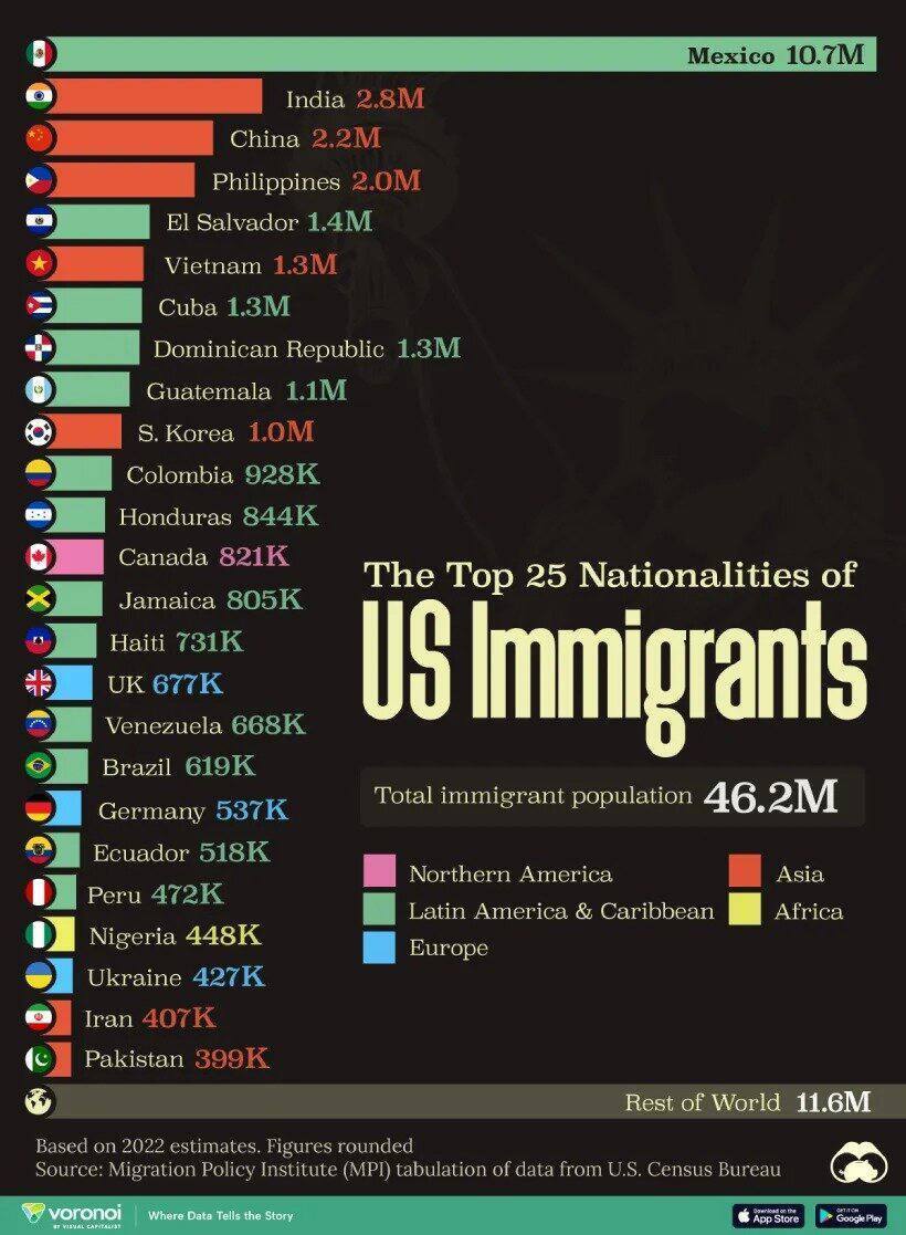 روزنو :ایالات متحده خانه بیش از ۴۶ میلیون مهاجر است که تقریباً ۱۴٪ از کل جمعیت آن را تشکیل می‌دهند. اینفوگرافیک ۲۵ کشور مبدأ مهاجران ایالات متحده را بر اساس برآورد‌های سال ۲۰۲۲ نشان می‌دهد. ایران با ۴۰۷ هزار مهاجر به آمریکا در ردیف ۲۴ این جدول قرار دارد.