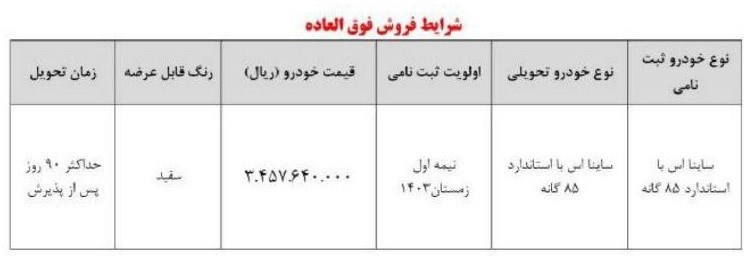 پیرو اعلام نتایج در سامانه یکپارچه تخصیص خودرو به اطلاع نمایندگی ها و متقاضیان حائز شرایطی که در طرح عادی سامانه مذکور در سال گذشته نسبت به ثبت نام اولیه خودرو ساینا اس اقدام نموده و در تاریخ ۱۴۰۳/۰۵/۱۵ پیامک به ایشان ارسال شده میرساند، امکان واریز وجه خودرو و ثبت نام مطابق شرایط ذیل اعلام میگردد.