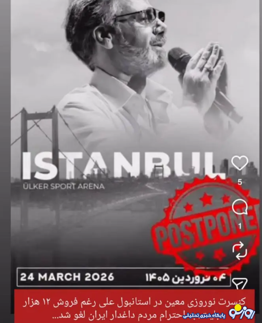 بهمن بابازده خبرنگار حوزه موسیقی: سه کنسرت بزرگ نوروز ۱۴۰۵ در استانبول (معین، شادمهر، اِبی) علی رغم اتمام کلیه بلیت ها، به احترام مردم داغدار ایران لغو شدند. با این اوصاف هیچ کنسرت خواننده ایرانی در هیچ کجای جهان تا اطلاع ثانوی برگزار نخواهد شد.